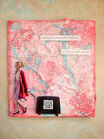 Zaczęło się niewinnie - od poszukiwania inspiracji w nowych wyzwaniach scrapowych. Znalazłam trzy, które połączyły to, co lubię najbardziej: mediowanie, kolory i wycinanki z gazet. Otworzyłam stary numer "Zwierciadła"... i tak się zaczęło :) Trafiłam na tekst, który powalił mnie na kolana (po chwili przewaliłam się na cyce). Już dawno nie zrobiłam niczego tak osobistego. Dziękuje 13arts, Projektowi Wagi Ciężkiej i scrapkom-wyzwaniowo za fantastyczne wyzwania na które zgłaszam mój mediowy obrazek.