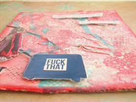 Tło powstało na papierze akwarelowym, przyklejonym do tektury. Podarłam stronę z książki i przykleiłam ją na gesso. Pobawiłam się moimi nowymi farbkami 13@ Coral i Turquise, do tego czarny i czerwony tusz. Fantastyczna zabawa i fantastyczne wyzwania!